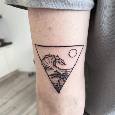 Tetování srdce se jménem, cestování, moře, ruka na rameni