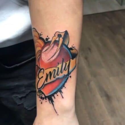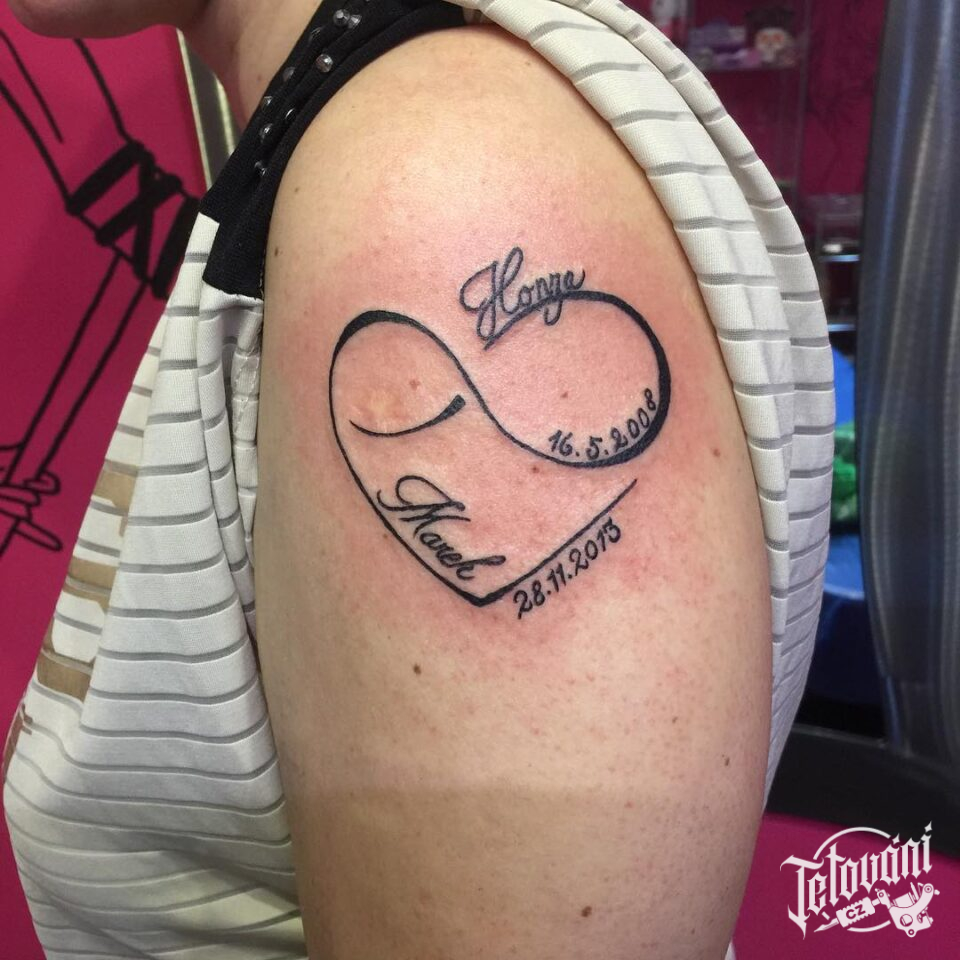 Tetování srdce se jmény na rameni