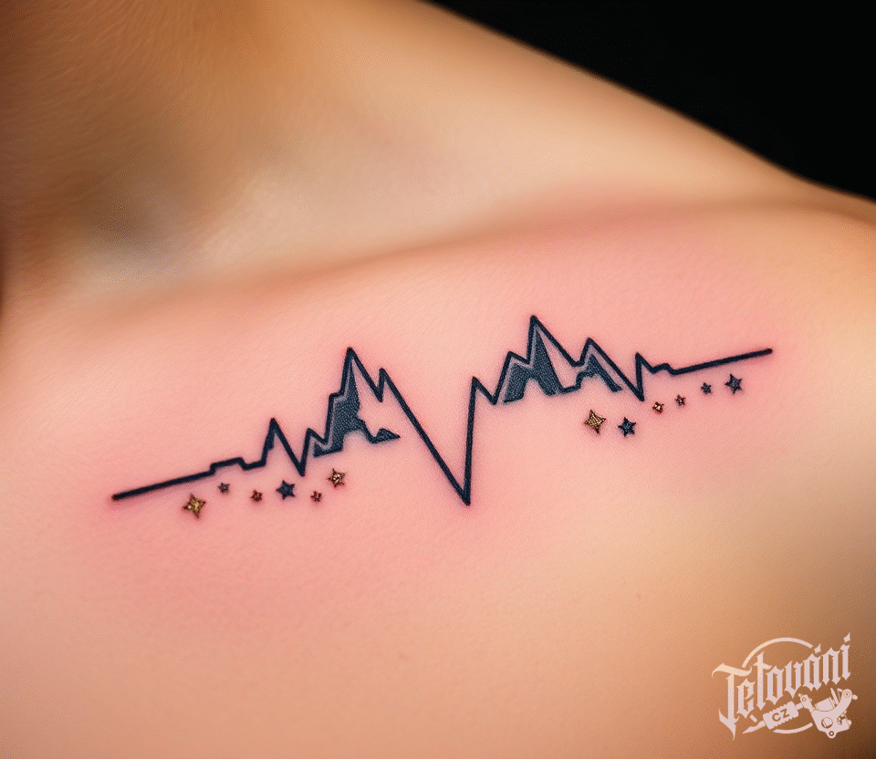 Tetování srdce, tep srdce a příroda, hory pod klíční kost