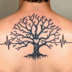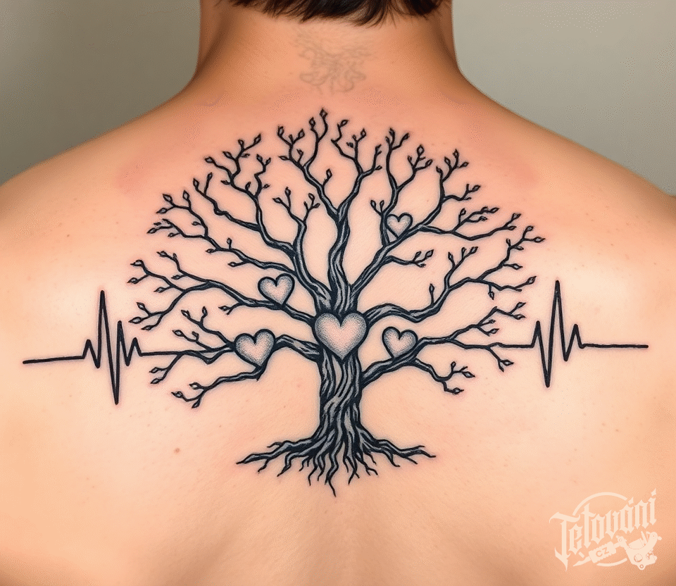 Tetování srdce, tep srdce a strom, strom rodiny na záda