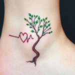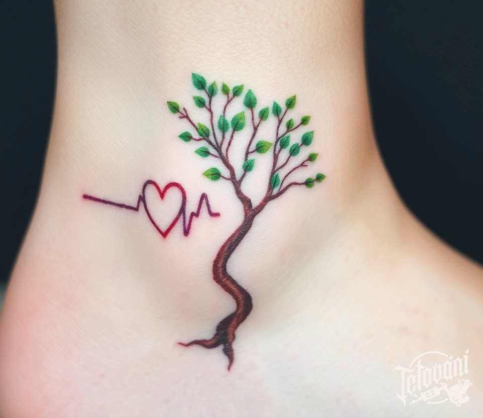 Tetování srdce, tep srdce a strom, strom života na kotník