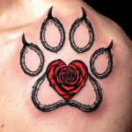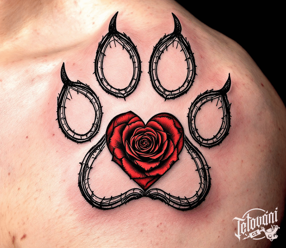 Tetování srdce, tlapka srdce a květina, růže na rameno