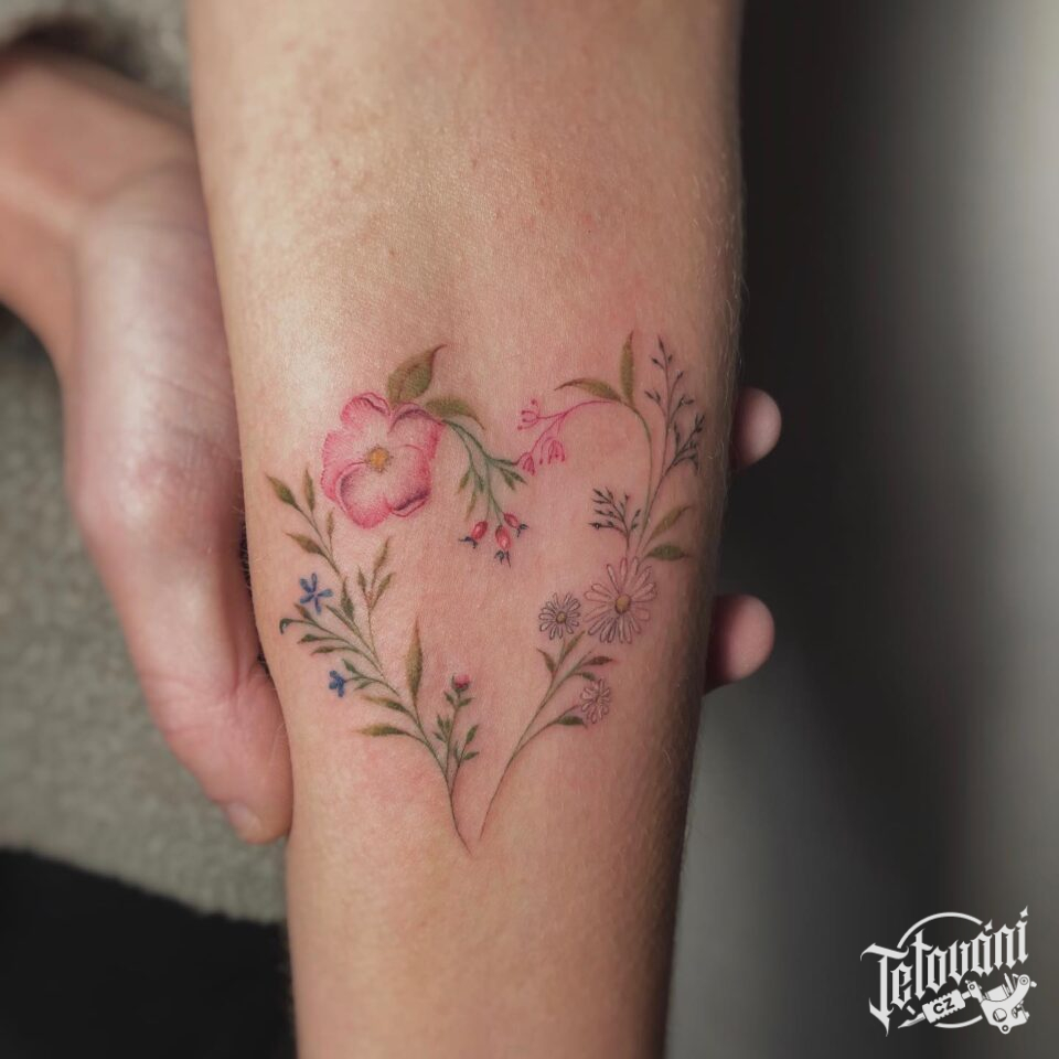 Tetování srdce z květin na předloktí