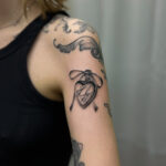 Tetování srdíčko s písmem a s mašlí a nápisem na rameni