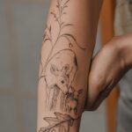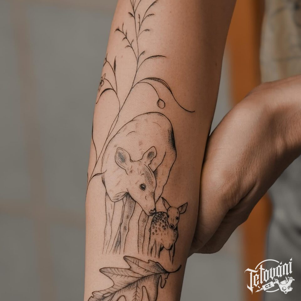 Tetování srnka a mláďě, symbol rodiny, luční kvítí na předloktí