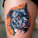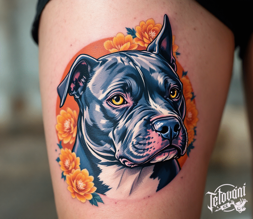 Tetování staford s květinami na stehně