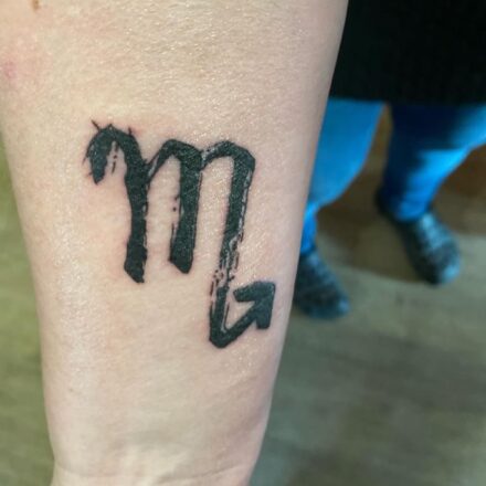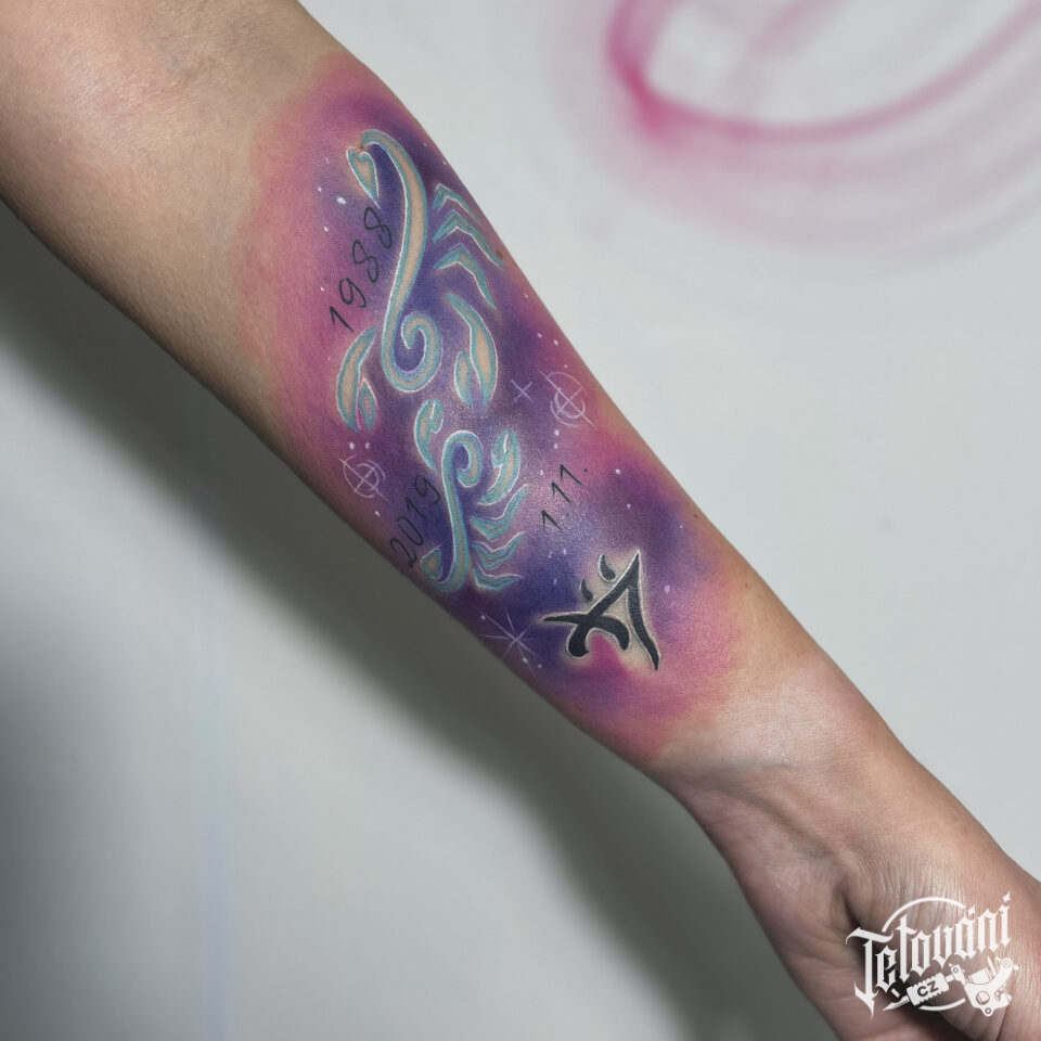Tetování štír znamení zvěrokruhu a data narození na předloktí