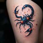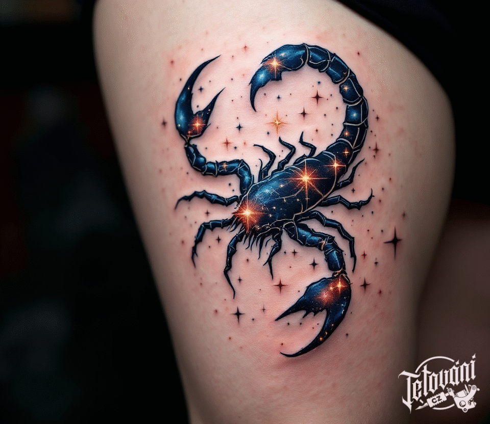 Tetování štír znamení zvěrokruhu, škorpion, souhvězdí štíra na stehně