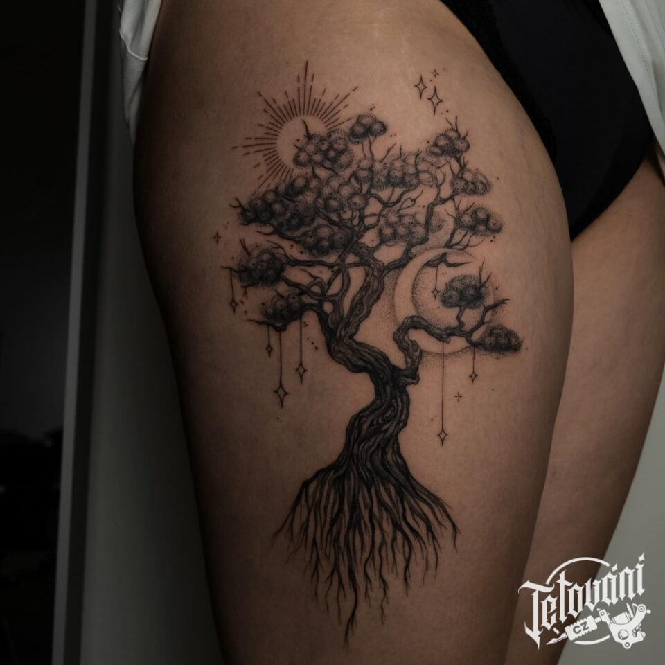 Tetování strom na boku stehna