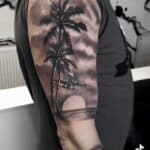 Tetování strom, palma, moře, dopravní prostředek letadlo na rameno