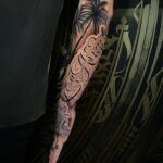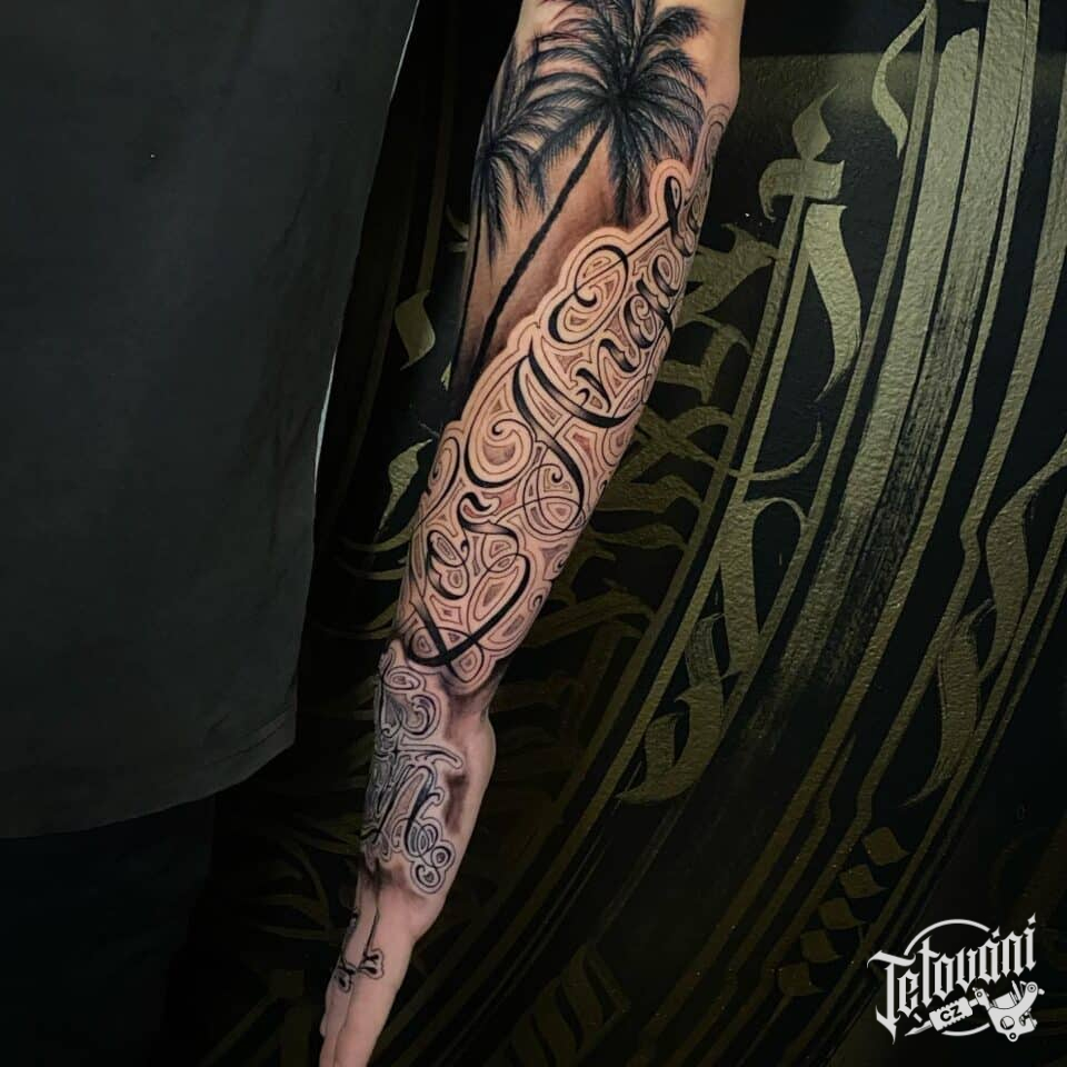 Tetování strom, palmy a nápis na předloktí