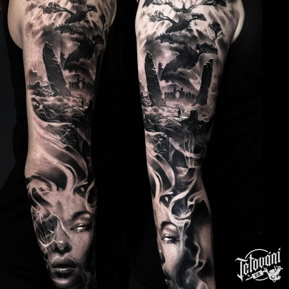 Tetování strom, portrét ženy, příroda, rukáv