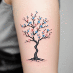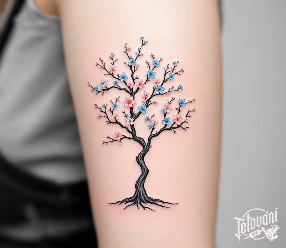 Tetování strom s barevnými květy, rodokmen na rameno