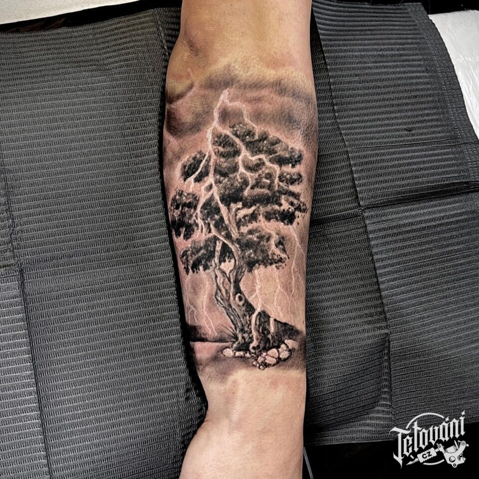 Tetování strom s blesky na předloktí
