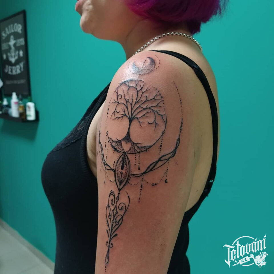 Tetování strom s ornamenty na rameni