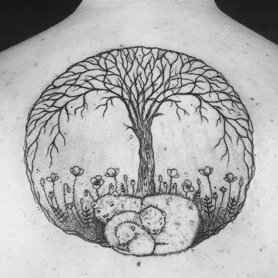 Tetování strom se zvířaty a květinami na zádech
