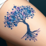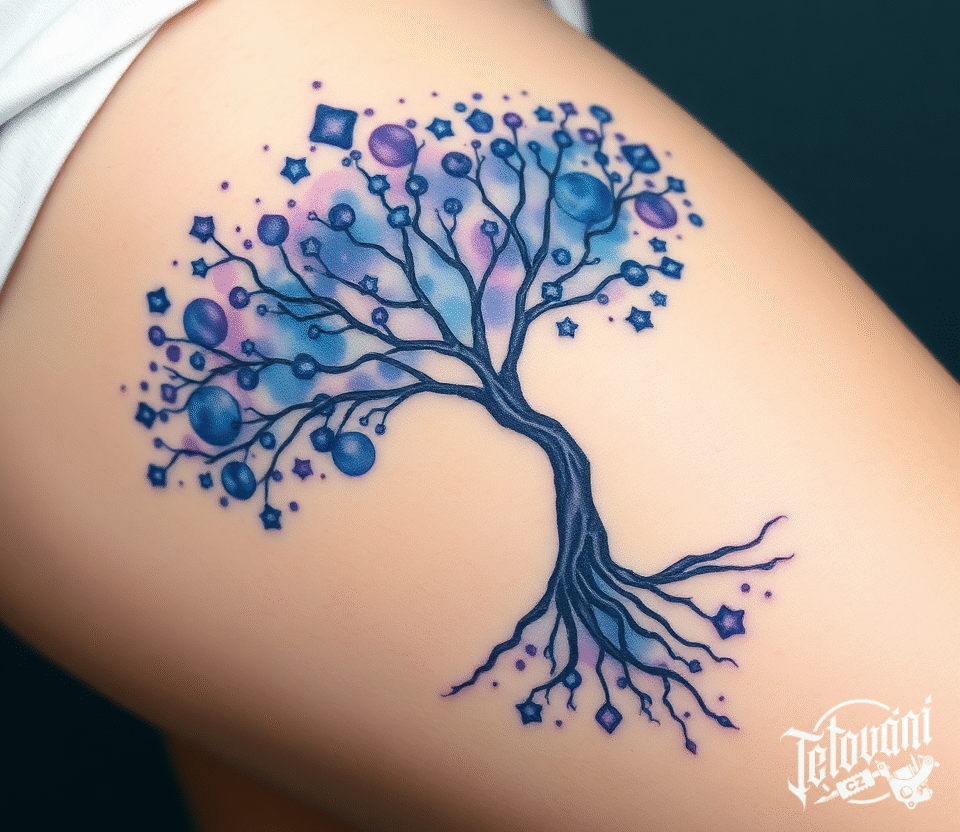 Tetování strom, strom rodiny a vesmír na boku stehna