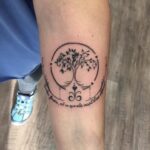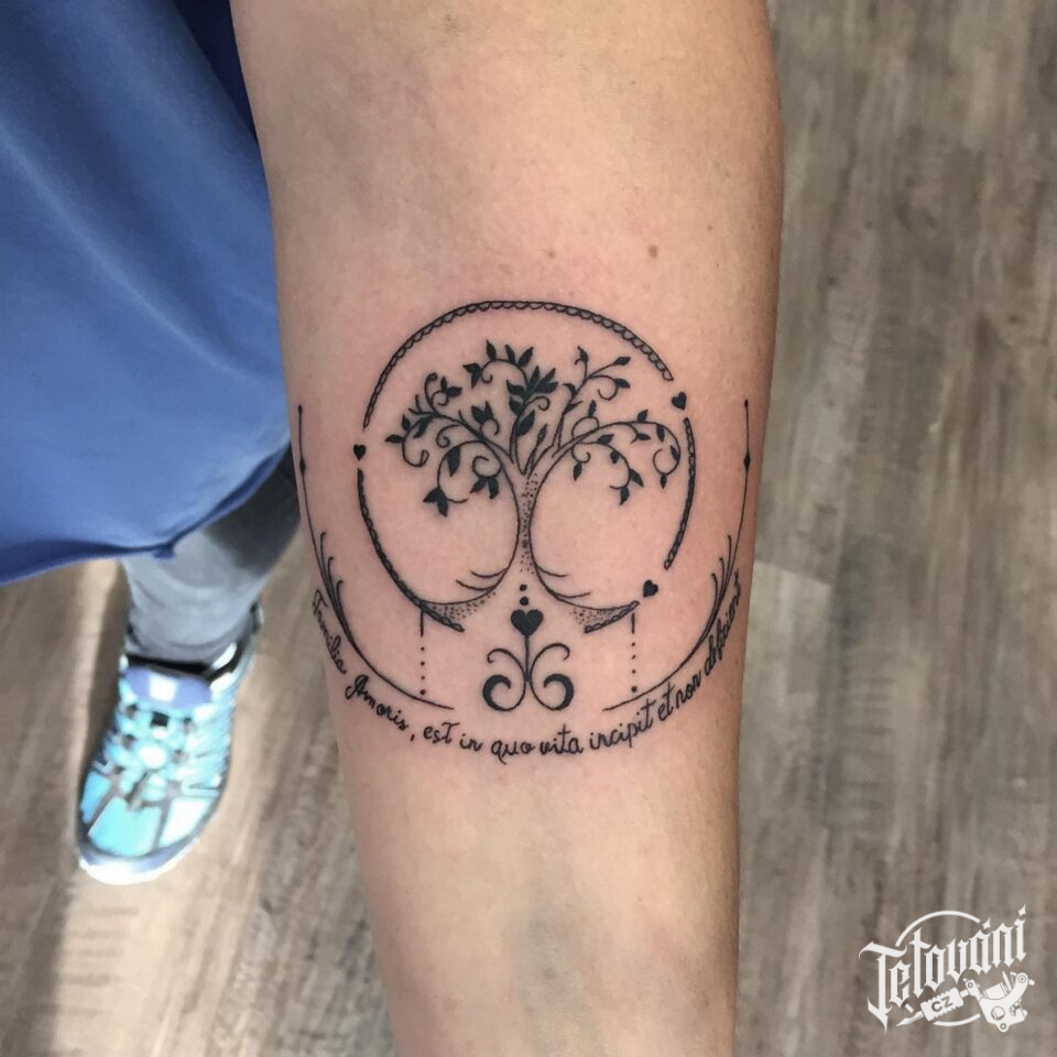 Tetování strom, strom života a nápisy na předloktí