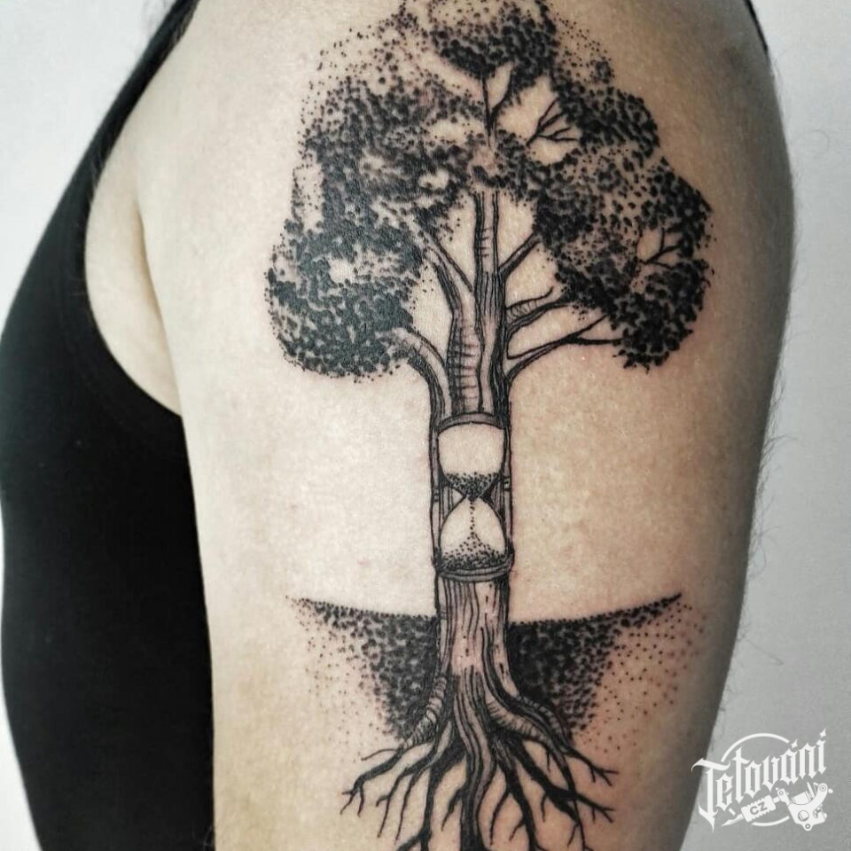 Tetování strom života a přesýpací hodiny na rameni