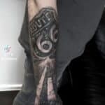 Tetování symbol, cesta, čísla, nápisy na předloktí a hřbet ruky