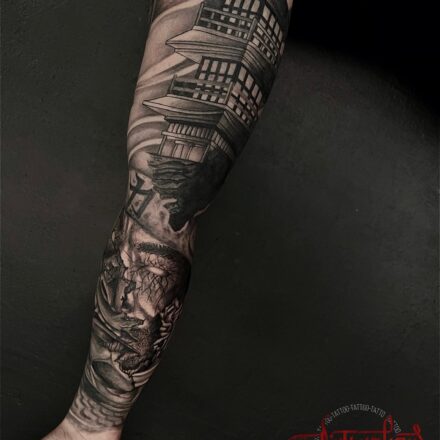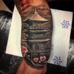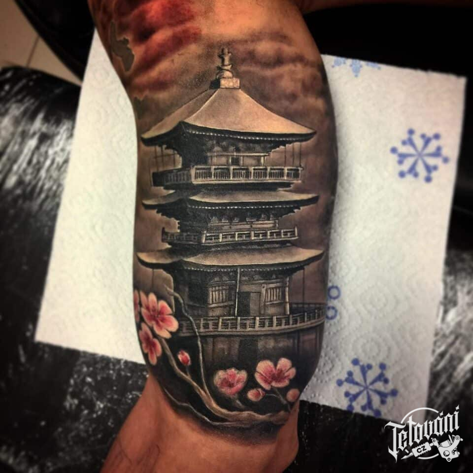 Tetování symbol cestování, japonská architektura, květiny Sakura na rameno