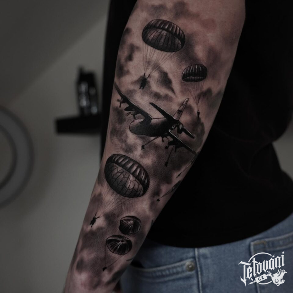 Tetování symbol dopravní prostředek letadlo, vojáci na předloktí