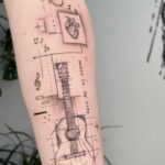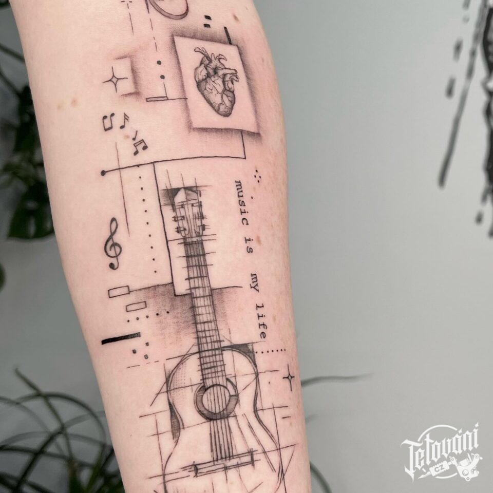 Tetování symbol hudby, kytara noty houslový klíč a srdce na předloktí