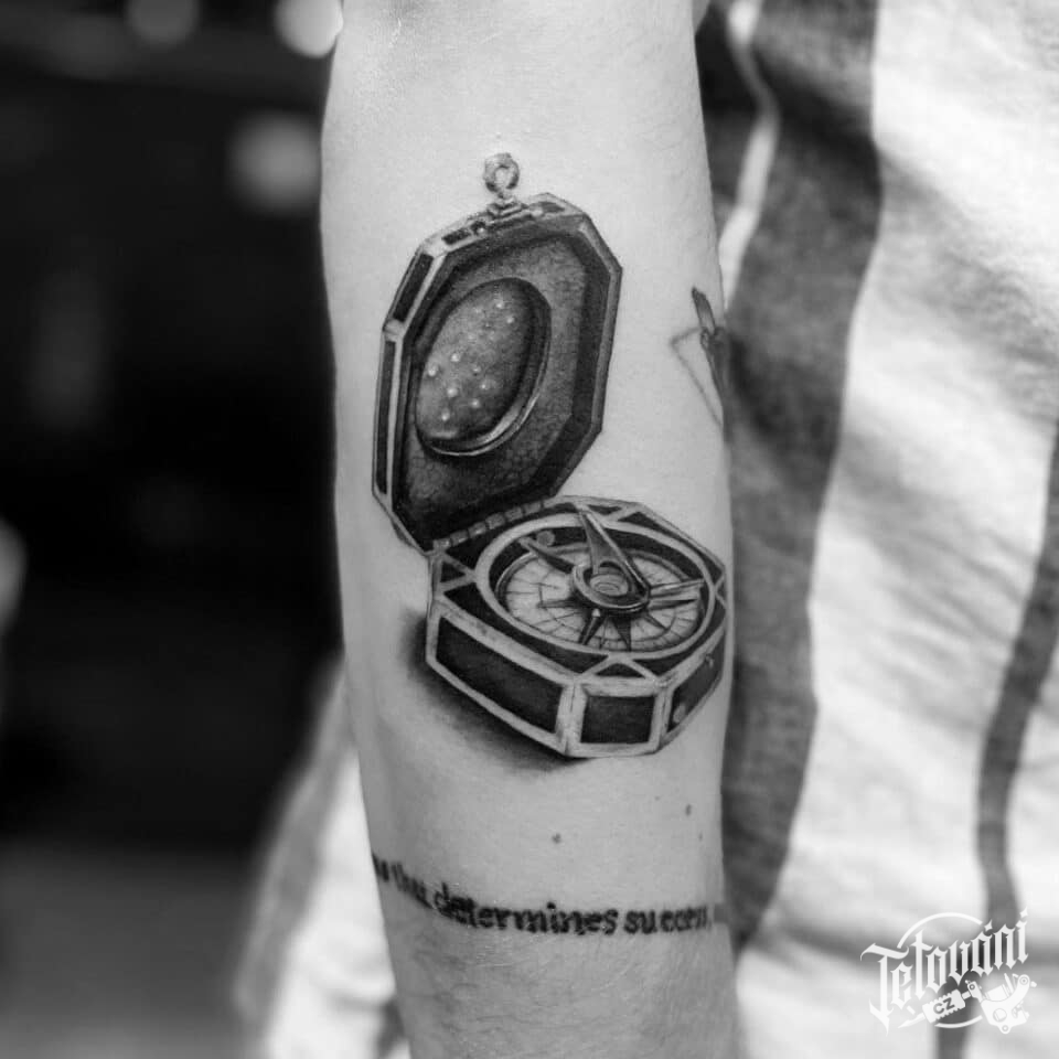 Tetování symbol kompas, znaky a symboly na předloktí