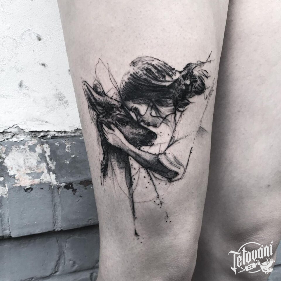 Tetování symbol lásky a ochrany, žena a zvíře na stehně