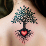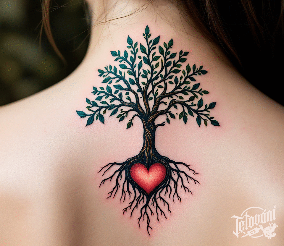 Tetování symbol mateřské lásky, strom, srdce mezi lopatky