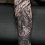 Tetování symbol rodiny, hodiny, dítě, jména na předloktí