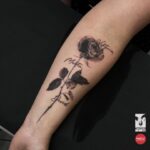 Tetování symbol rodiny, květina růže se jmény na předloktí