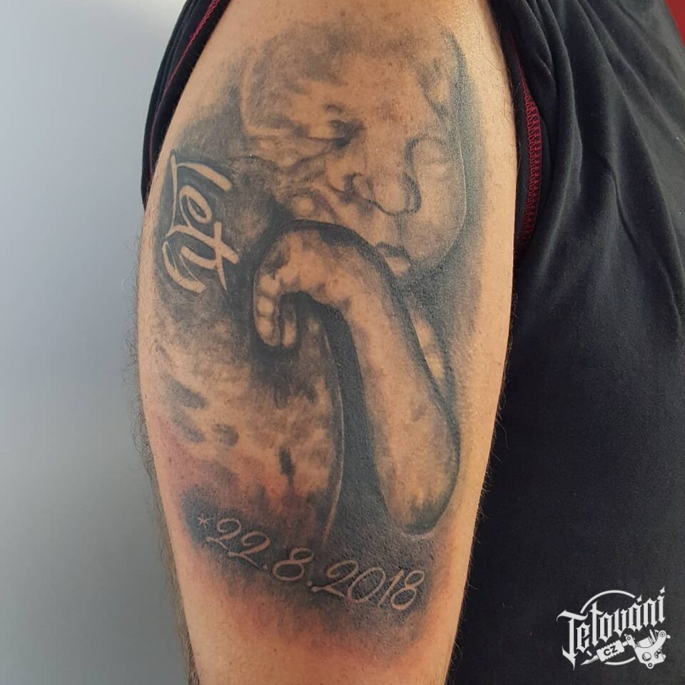 Tetování symbol rodiny, nápis, datum na rameno