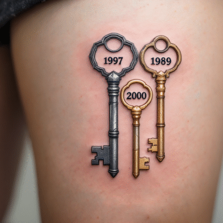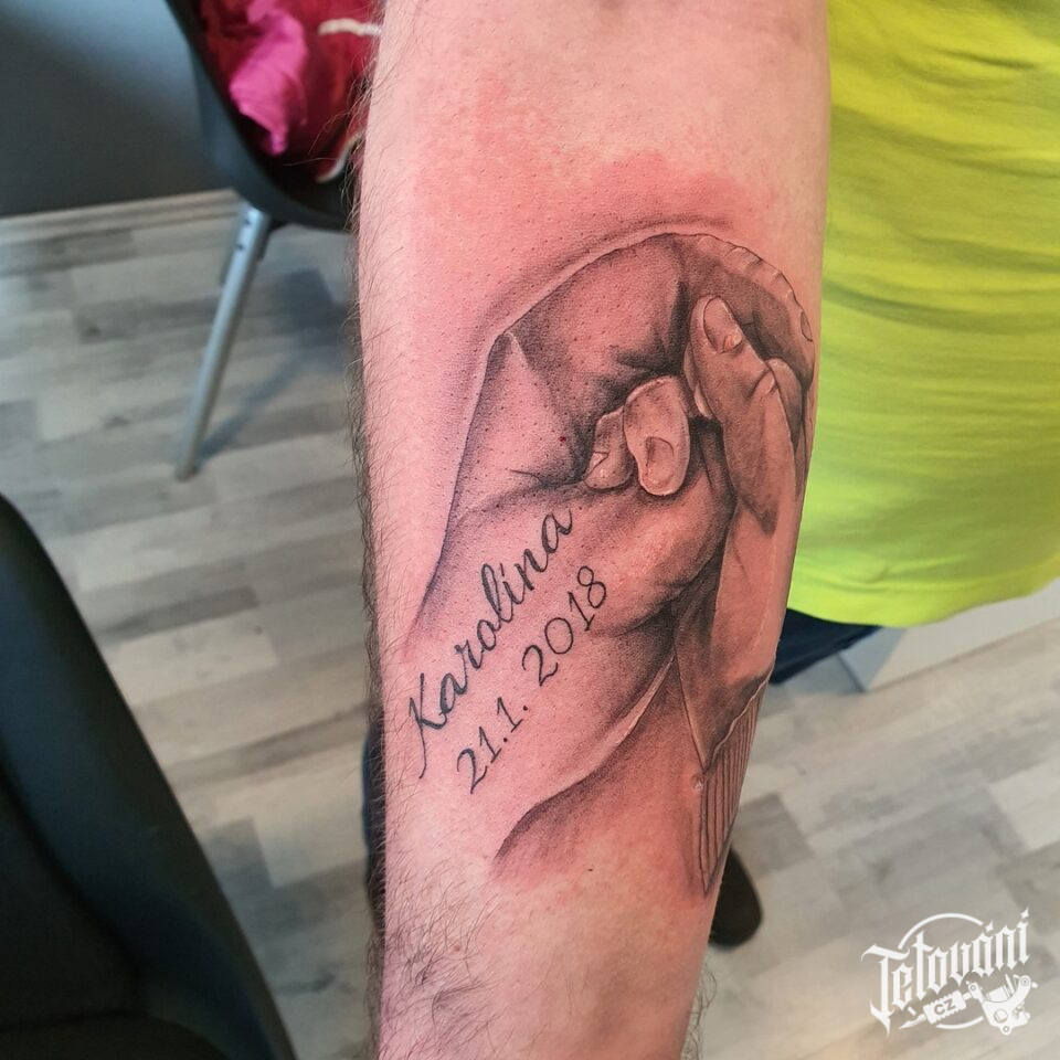 Tetování symbol rodiny, ruce, nápis jméno a datum narození na předloktí