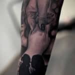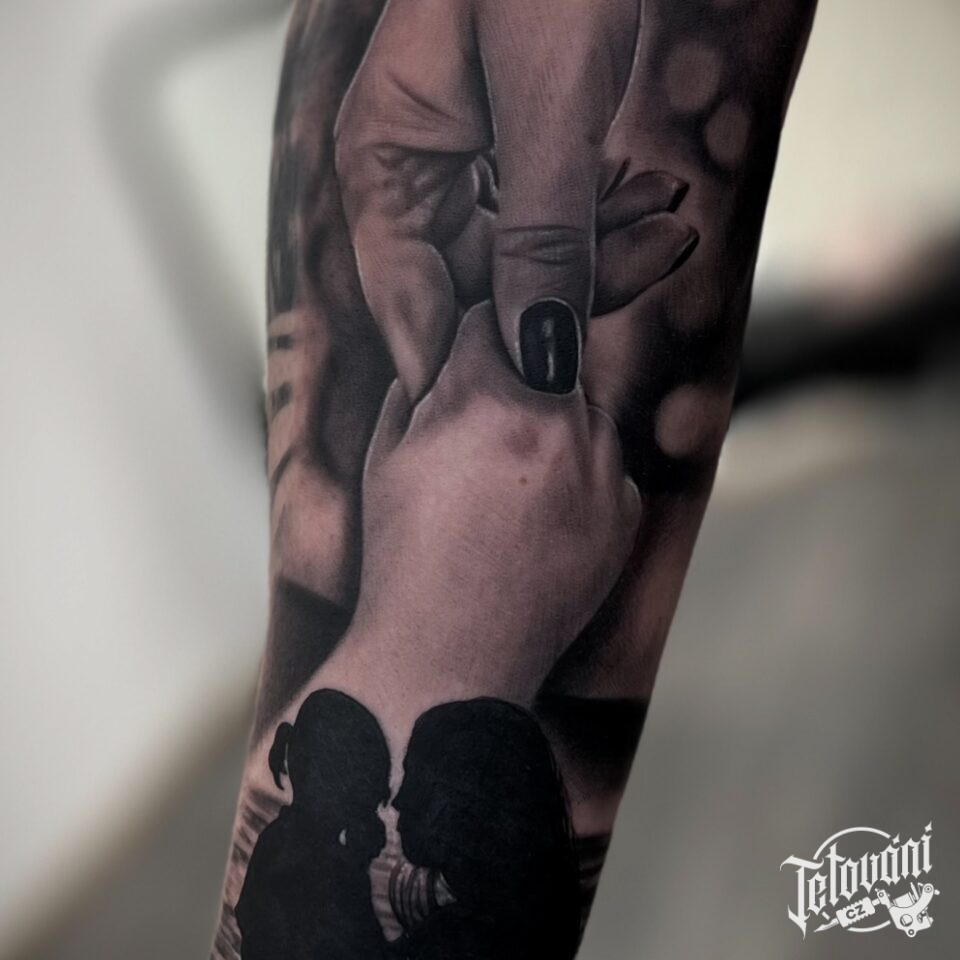 Tetování symbol rodiny, ruce, rodina, žena, dítě na předloktí