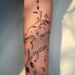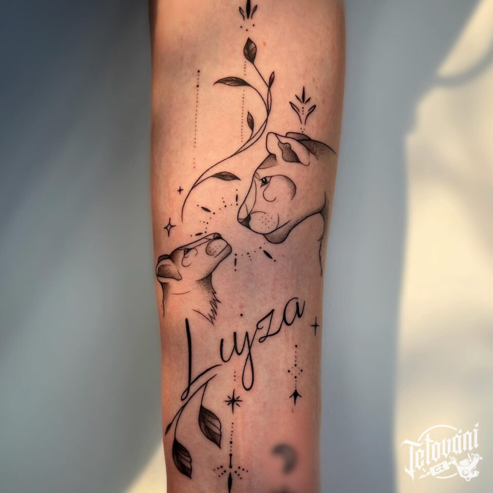 Tetování symbol rodiny, znamení zvěrokruhu lvice a lvíče, jméno, nápis na předloktí