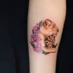 Tetování symbol rodiny, zvířata lvice a lvíčata, květiny růže na rameno