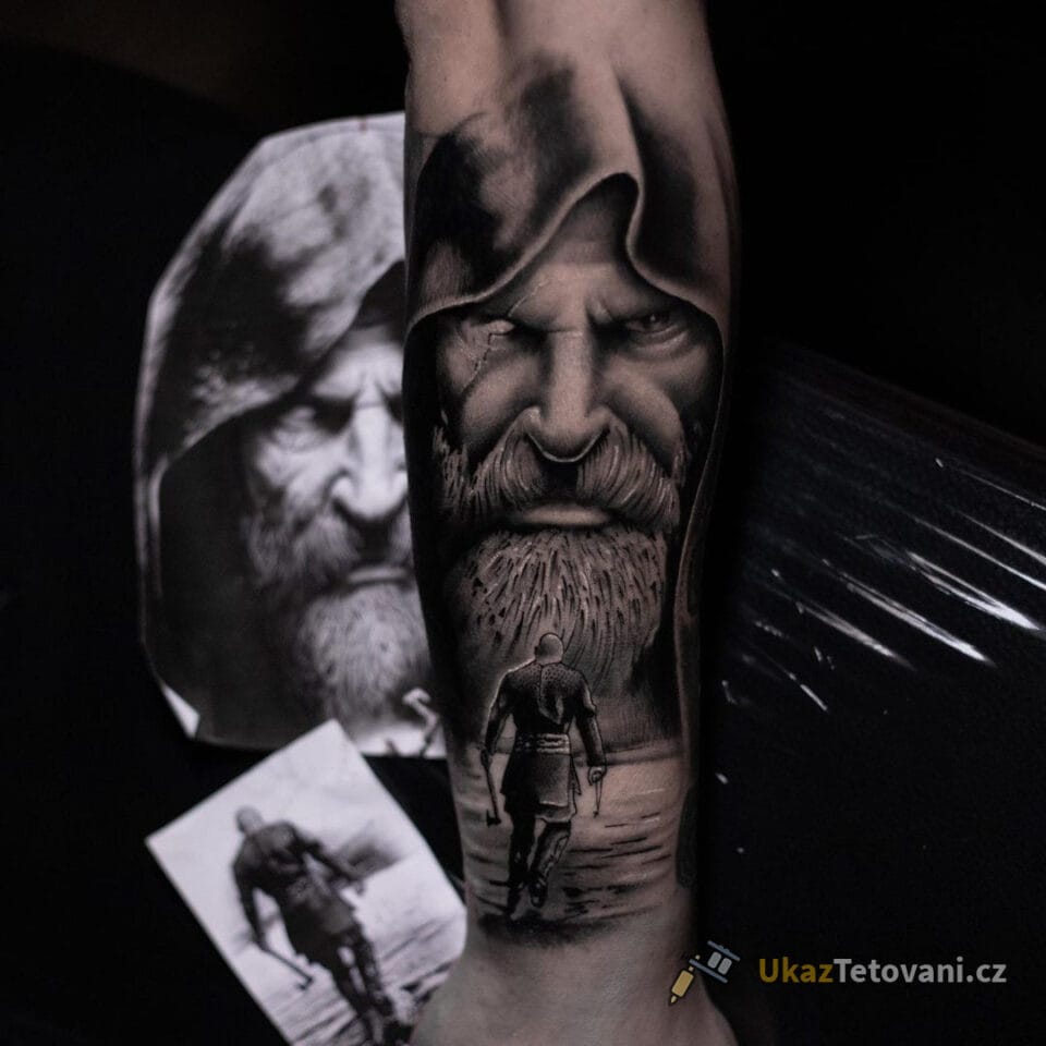 Tetování symbol síly, bojovník, portréty na předloktí