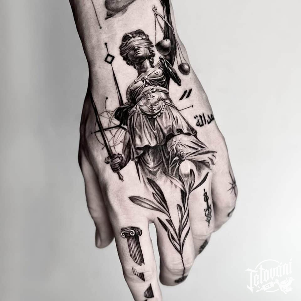 Tetování symbol spravedlnosti na hřbetu ruky