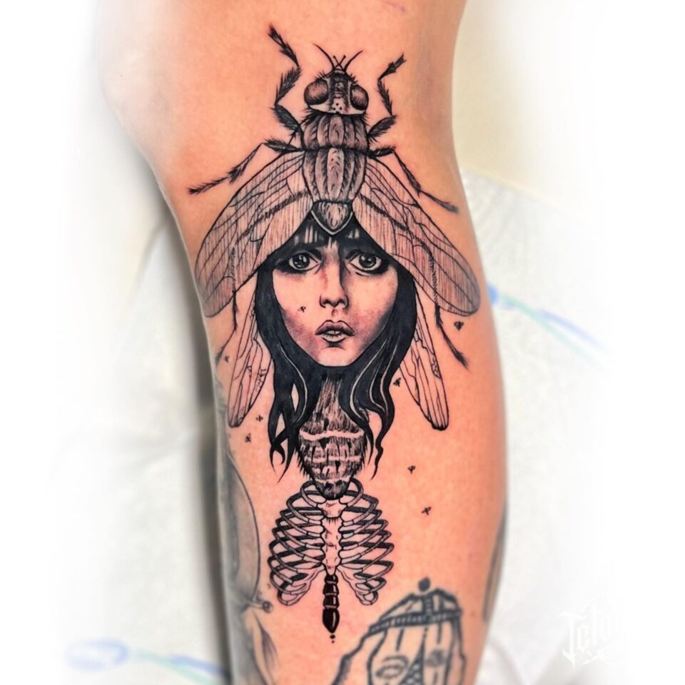 Tetování symbol žena, zvíře moucha, žebra na lýtko