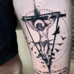 Tetování symbol života, náboženství, ukřižovaný Ježíš Kristus s citátem na stehno s