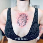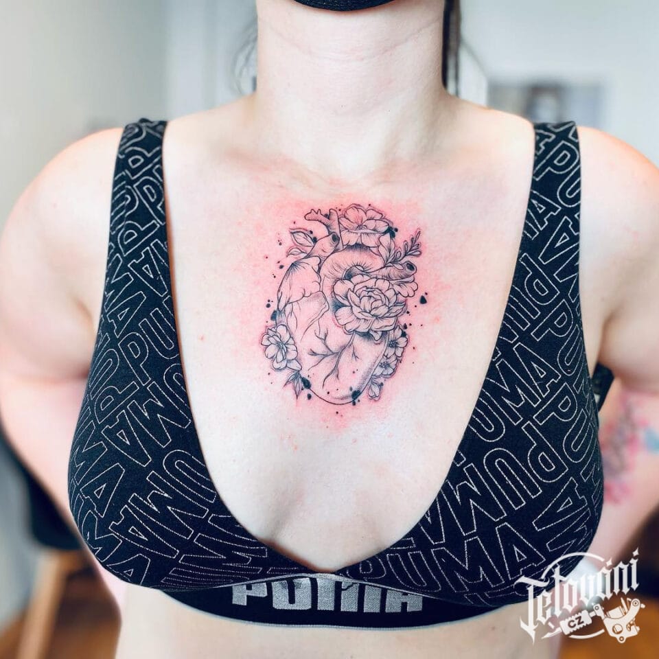 Tetování symbol života, srdce, květiny na hrudník