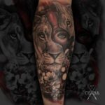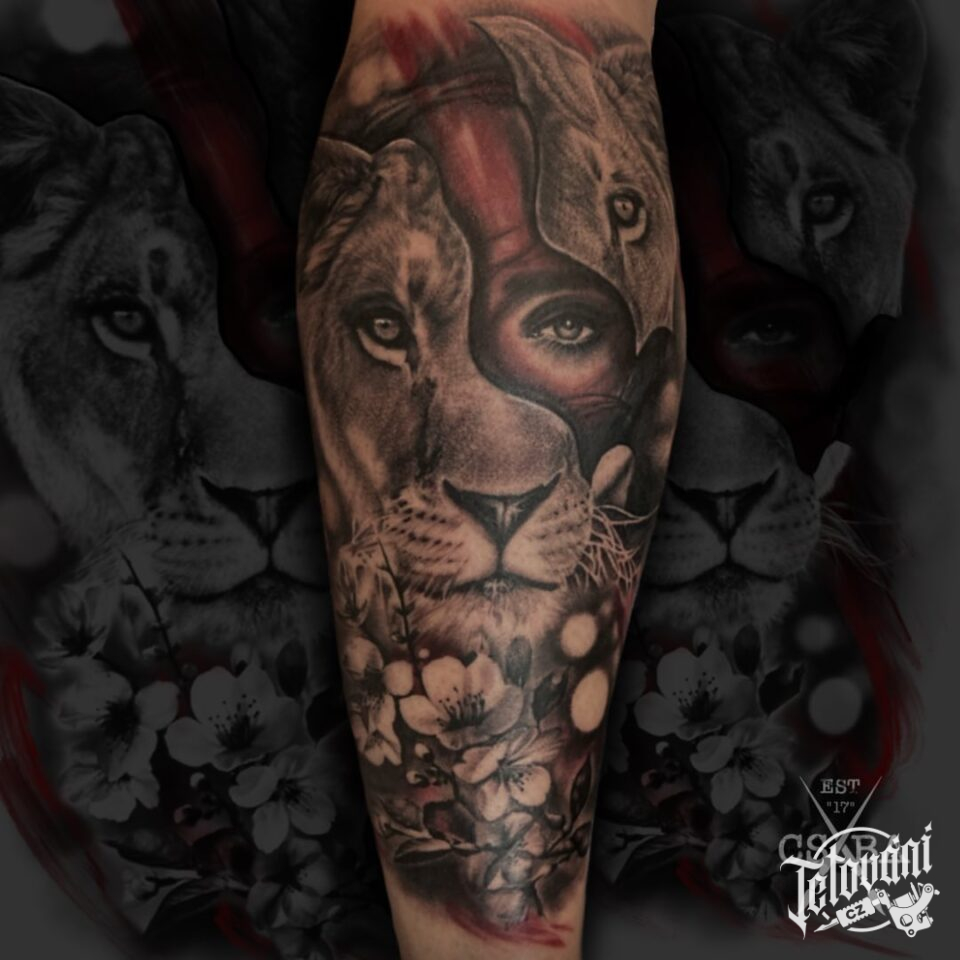 Tetování symbol života zvíře lvice a žena, květiny na lýtko