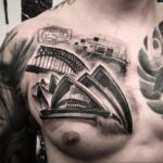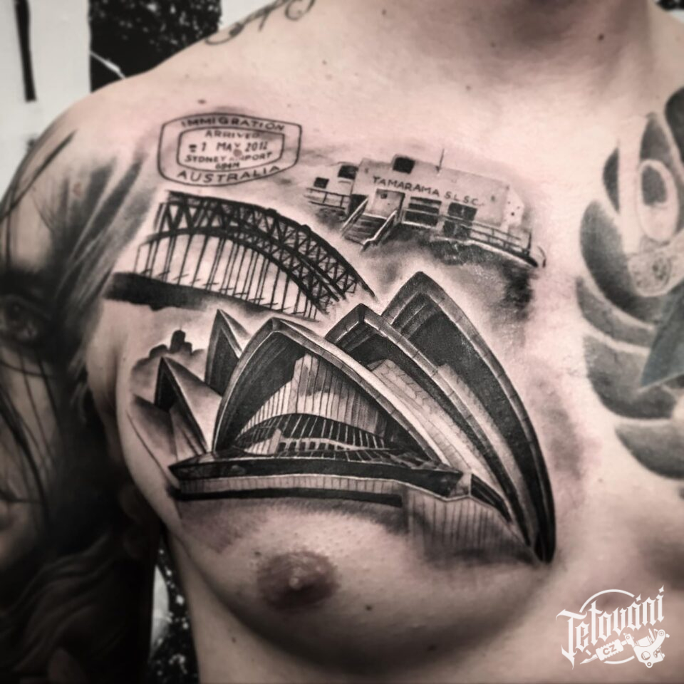 Tetování symboly cestování, opera v Sydney, nápisy na hrudník