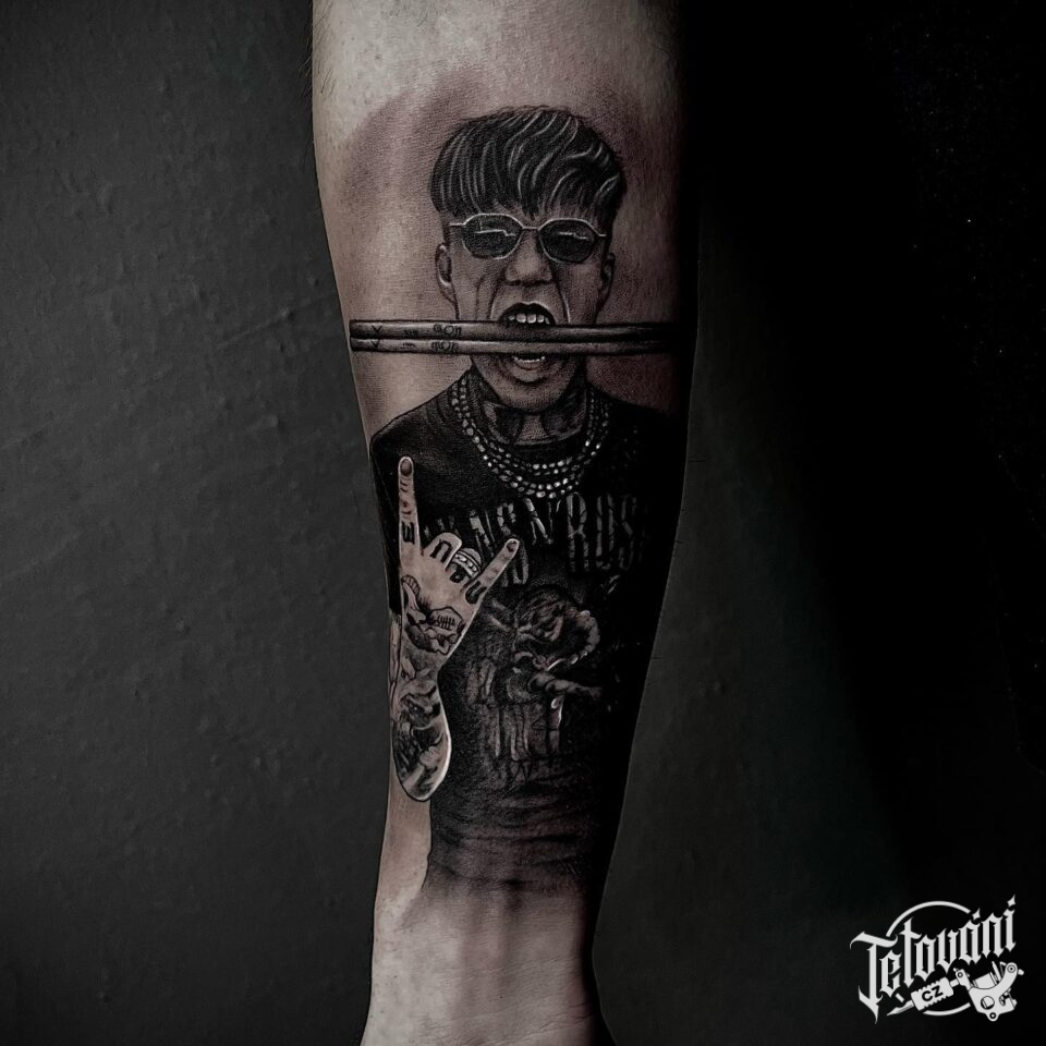 Tetování symboly hudba, portrét osobnosti na předloktí