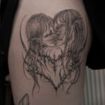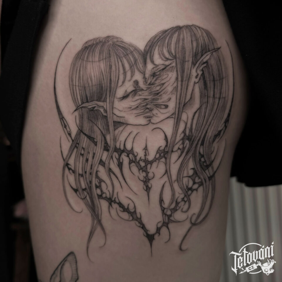 Tetování symboly lásky, nadpřirozené bytosti, ornamenty na bok stehna