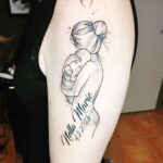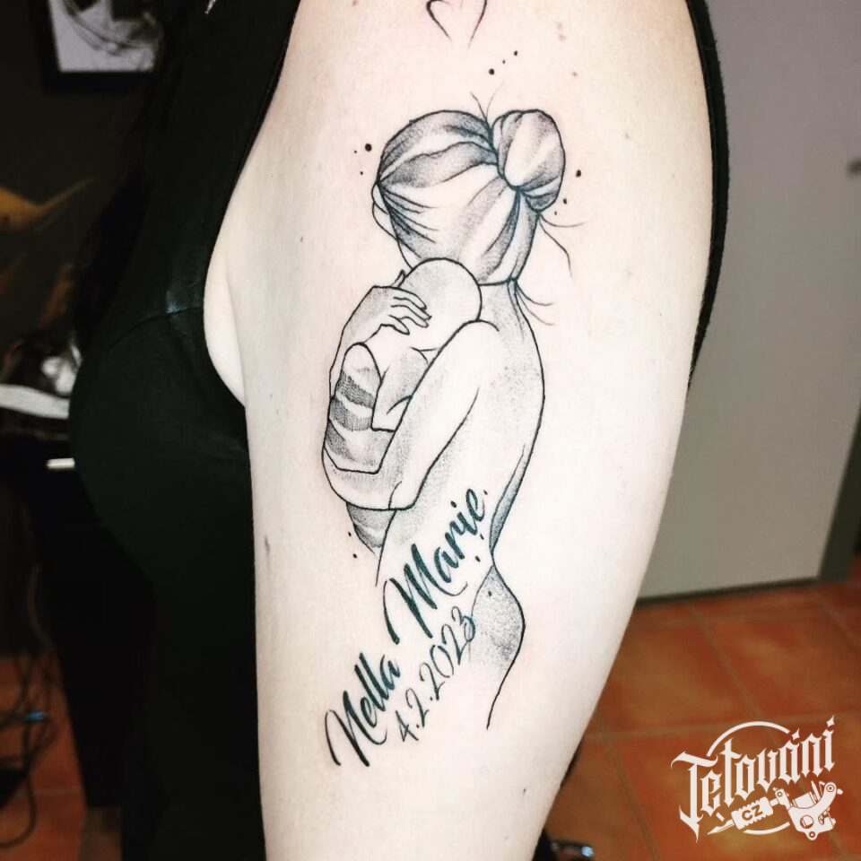 Tetování symboly mateřské lásky, jména děti s datumem narození na rameno