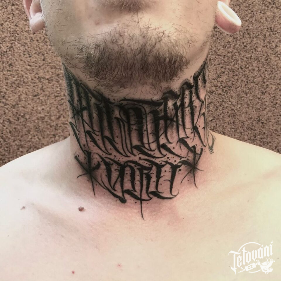 Tetování symboly, nápisy, písmena na krk