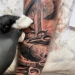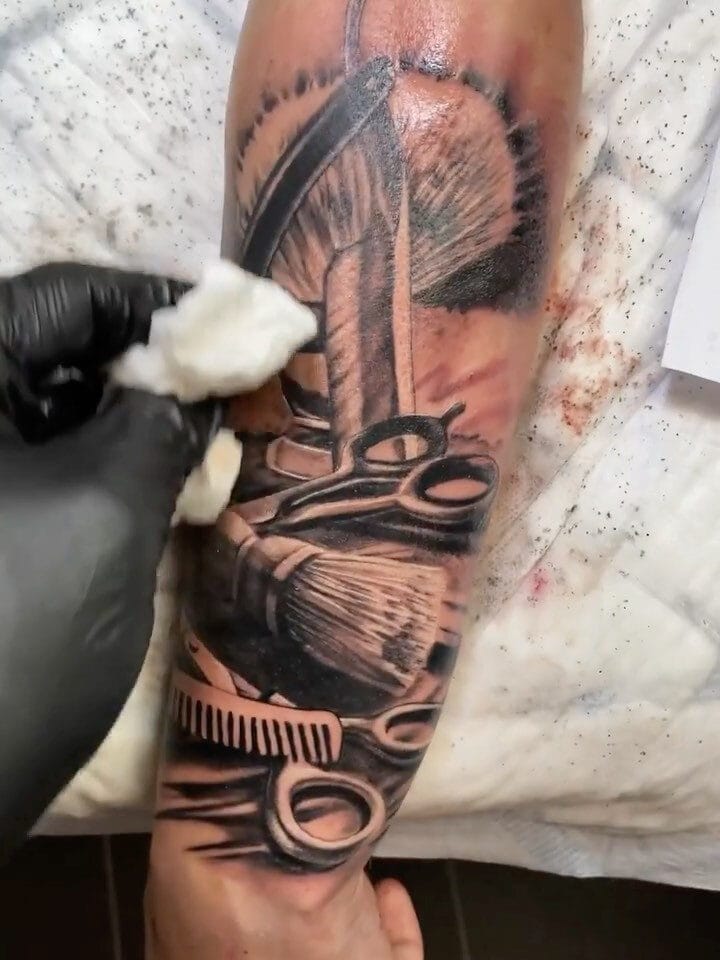 Tetování symboly nůžky a hřeben na předloktí