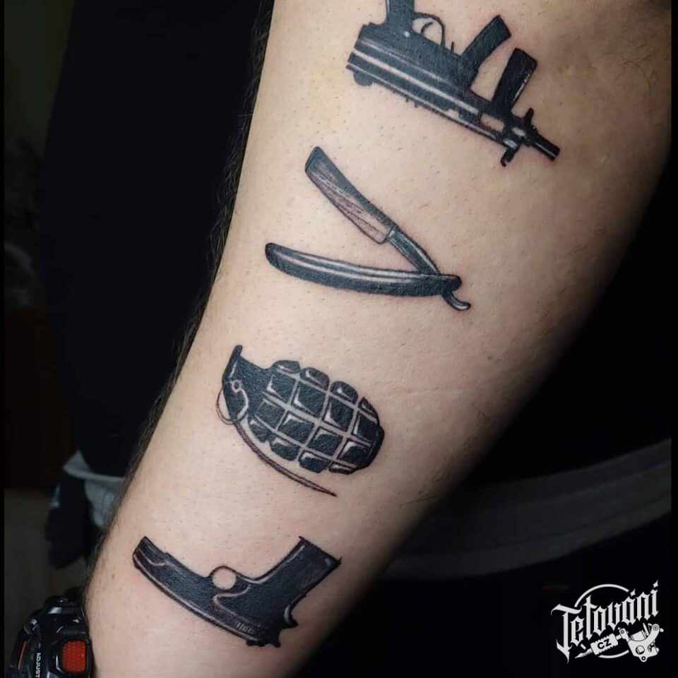 Tetování symboly síly, zbraně na předloktí
